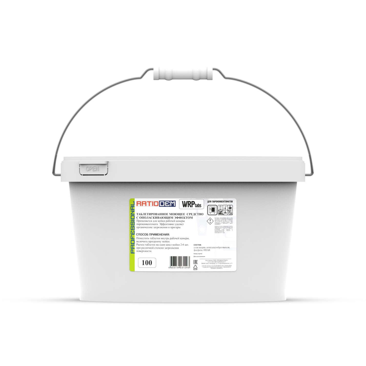Комплектация: 1 пластиковое ведро с крышкой содержит 100 индивидуально упакованных таблеток средства.